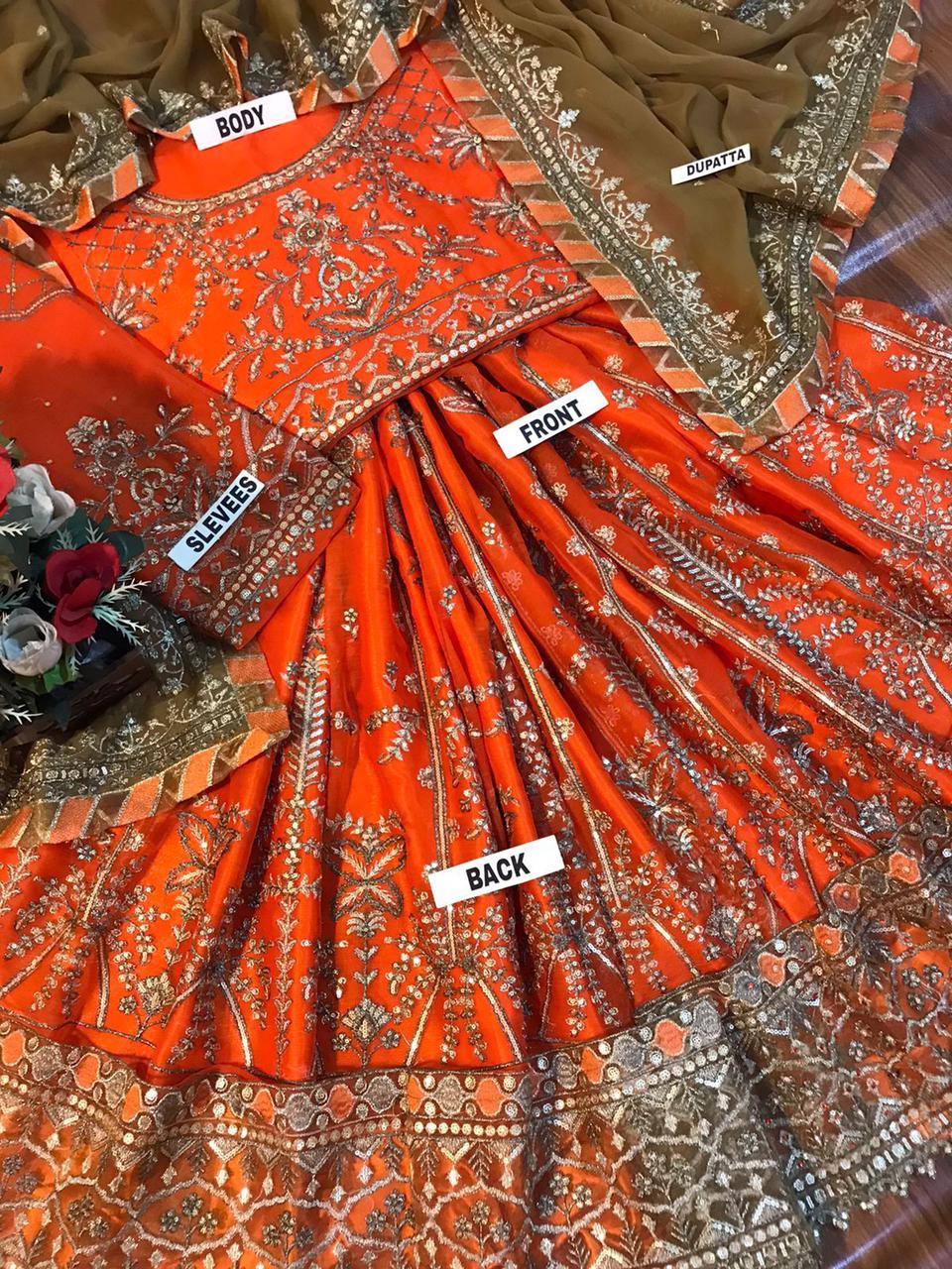 The back body mirrors the same exquisite embroidery and handwork, ensuring perfection from every angle. The full frock showcases detailed embroidery throughout, along with a heavy embroidered daman patch that adds volume and flair to the design.